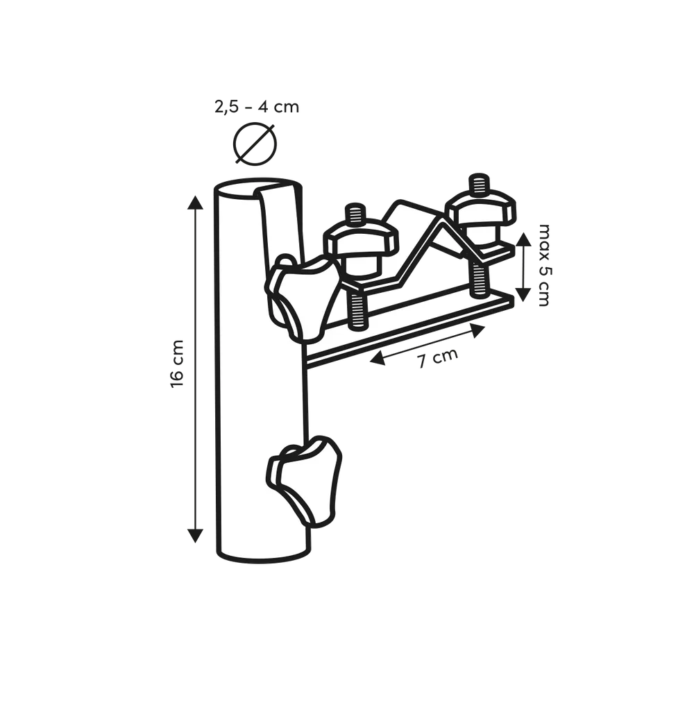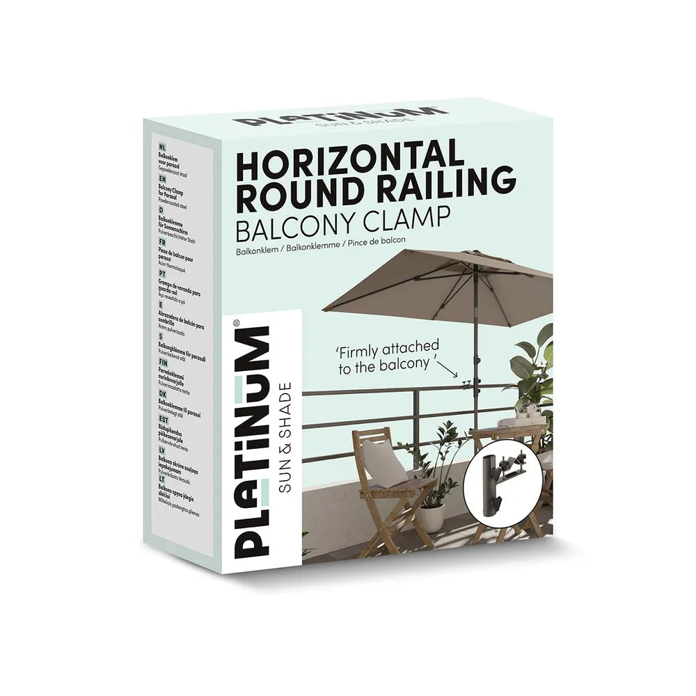 Platinum Sun & Shade balkonklem. Ideale oplossing voor het moeiteloos creëren van schaduw op het balkon. Geschikt voor horizontale ronde relings. Niets staat in de weg om te kunnen genieten van het mooie weer.