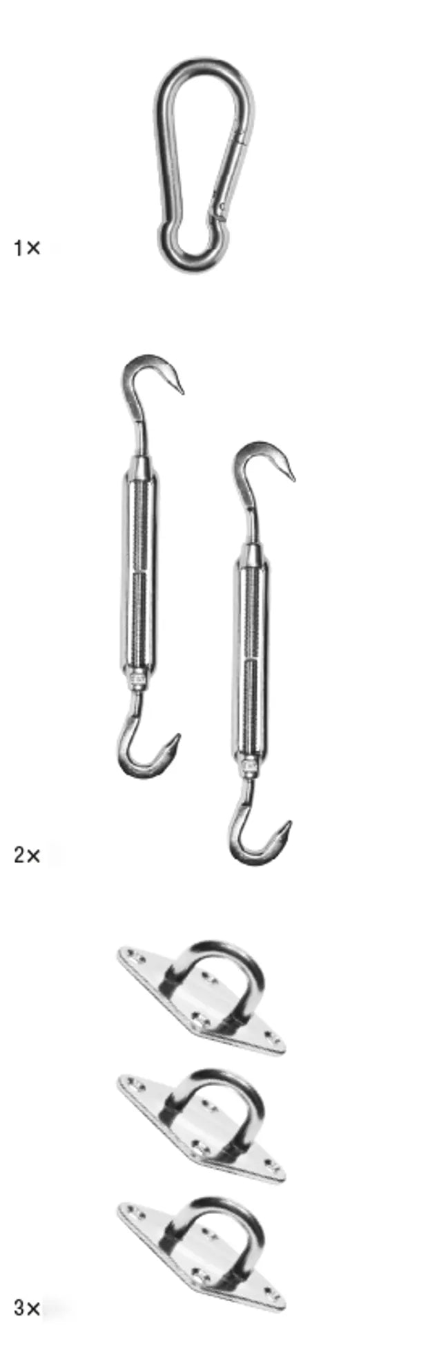 Een complete Platinum Sun & Shade montageset voor het probleemloos en makkelijk monteren van een driehoekig schaduwdoek. Voordat u het schaduwdoek monteert, is het belangrijk om eerst te bepalen waar het doek precies moet komen. Vervolgens monteert u de platen met oog op de juiste plek op de muur of paal. Gebruikmakend van de karabijnhaak en de spanmoeren kunt u het doek strak ophangen en zit het stevig vast. Platinum Sun & Shade bevestigingsmaterialen zijn gemaakt van hoogwaardig nautisch RVS316.