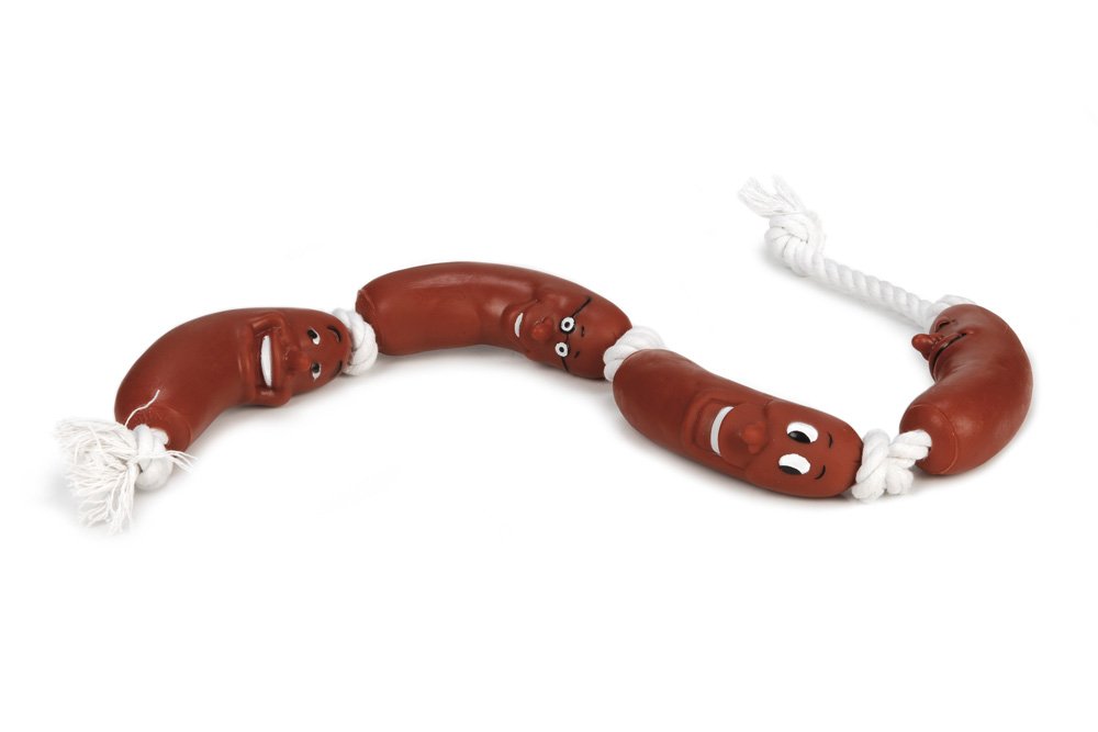 Wat is er nu leuker dan mogen spelen met een worst? Spelen met nog meer worsten! Dit kan met dit hondenspeelgoed van Beeztees. De vier worsten zijn gemaakt van vinyl en zijn met elkaar verbonden door middel van een katoenen flostouw. Het flostouw draagt al spelenderwijs bij aan de verzorging van de tanden van jouw hond. Om het spelen nog leuker te maken, beschikt dit hondenspeeltje over een pieper. Hierdoor worden de meeste honden nog meer aangezet tot spelen. Tip: geef jouw hond zijn worsten speeltje wanneer jullie aan het barbequen zijn, dan kan jouw hond toch een beetje meegenieten van al het lekkers.