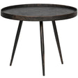 Deze stoere bijzettafel heeft een hoogte van 44 cm en is 58 cm in het rond. De opstaande rand rondom het tafelblad is 4 cm hoog. De poten zijn ieder 40 cm hoog. De tafel heeft een draagkracht van 20 kg wanneer gelijkmatig verdeeld of centraal geplaatst. De bijzettafel heeft zelf een gewicht van een kleine 9 kg.