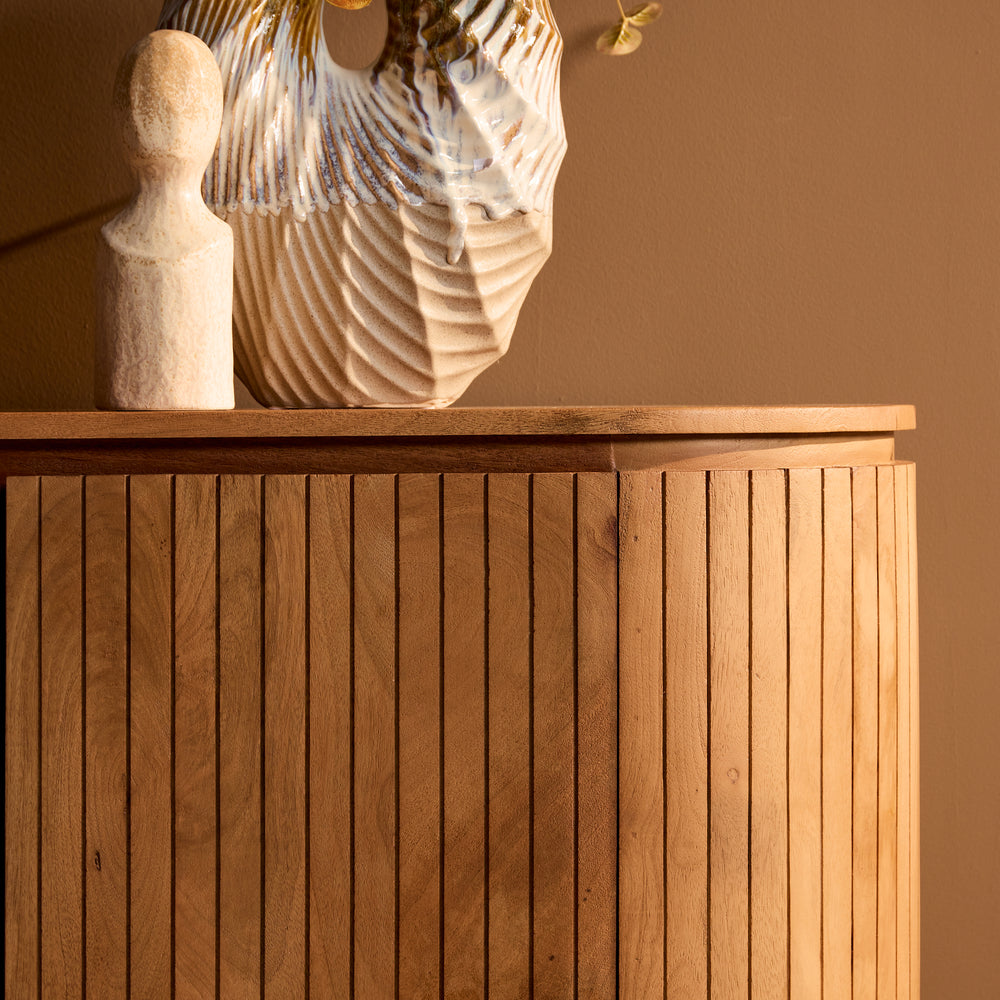 Dressoir Solana — strak en tijdloos met verticaal lattenpatroon. Drie deurtjes bieden ruime opbergruimte. Gemaakt van mangohout met metalen poten; handgemaakt, kleine kleur- en vormvariaties geven karakter. Afmetingen: B165×D45×H90 cm. Niet gemonteerd (eenvoudige montage). Onderhoud: afnemen met een lichtvochtige doek. Kleur naturel. Herkomst: India. Perfect te combineren met de Solana‑serie.