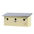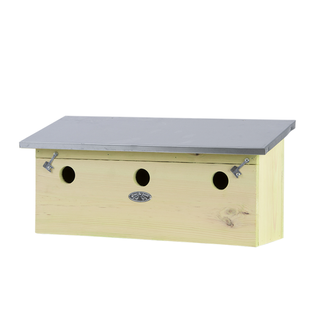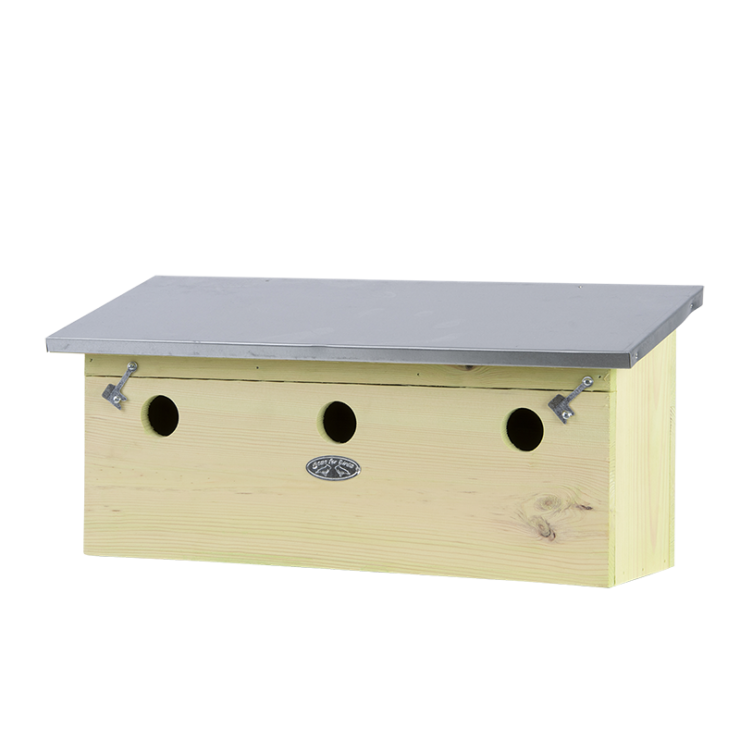 Deze mussenvilla bestaat uit drie woningen omdat mussen graag bij elkaar zitten. Behalve de huismus kunt u in deze kast ook de ringmus, koolmees en pimpelmees verwachten. Hang de kast op een rustige, enigszins beschutte plaats op. In de winter doet de kast vaak dienst als schuil- en slaapplek.