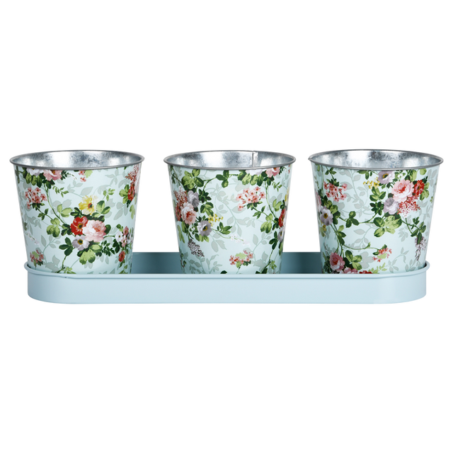 Potjes op tray met roosprint. Assortiment van 3. Maak jouw tuin gezellig met producten van Esschert design. Maak jouw tuin gezellig met producten van Esschert design.
