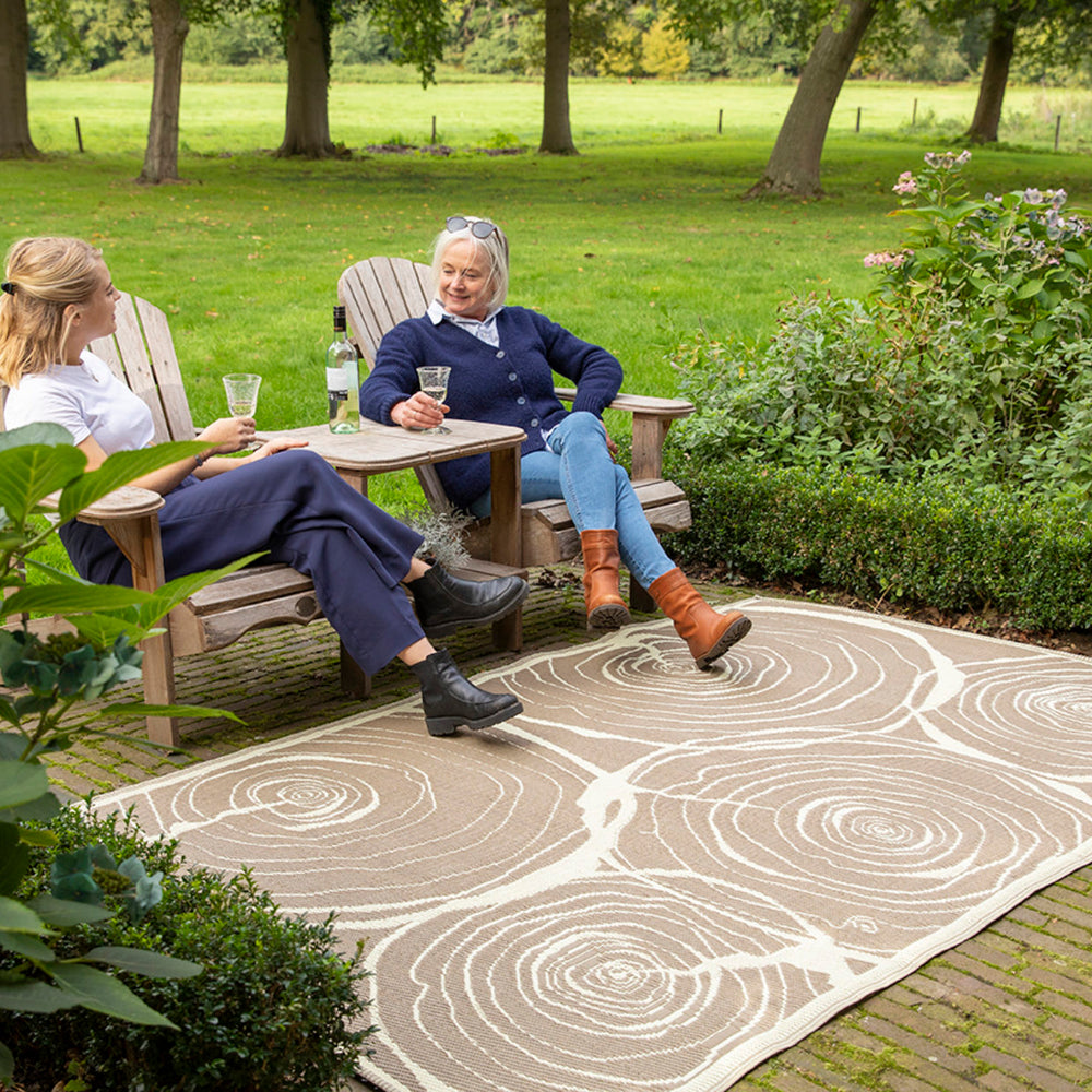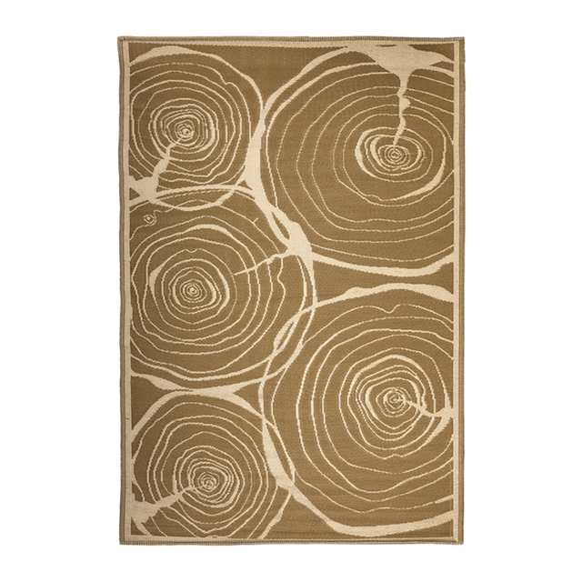 Dit rechthoekige tuintapijt met jaarringen is een mooie toevoeging aan de tuin of het terras. Het is zo geweven dat dit buitentuinkleed van esschert design aan beide zijden te gebruiken is.