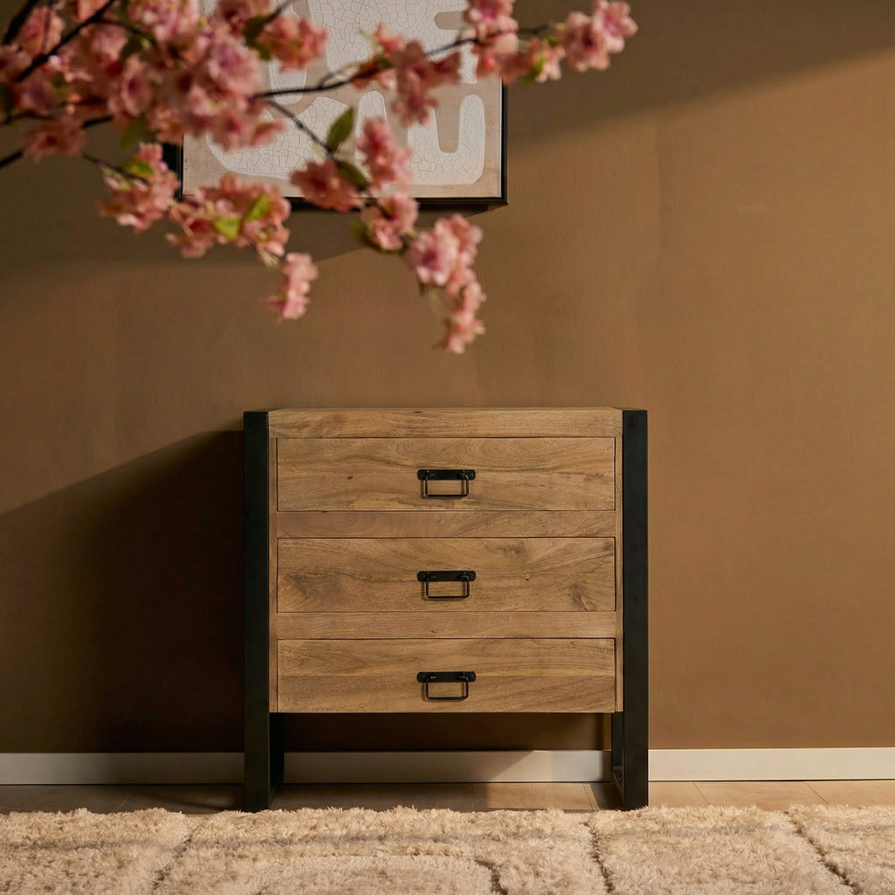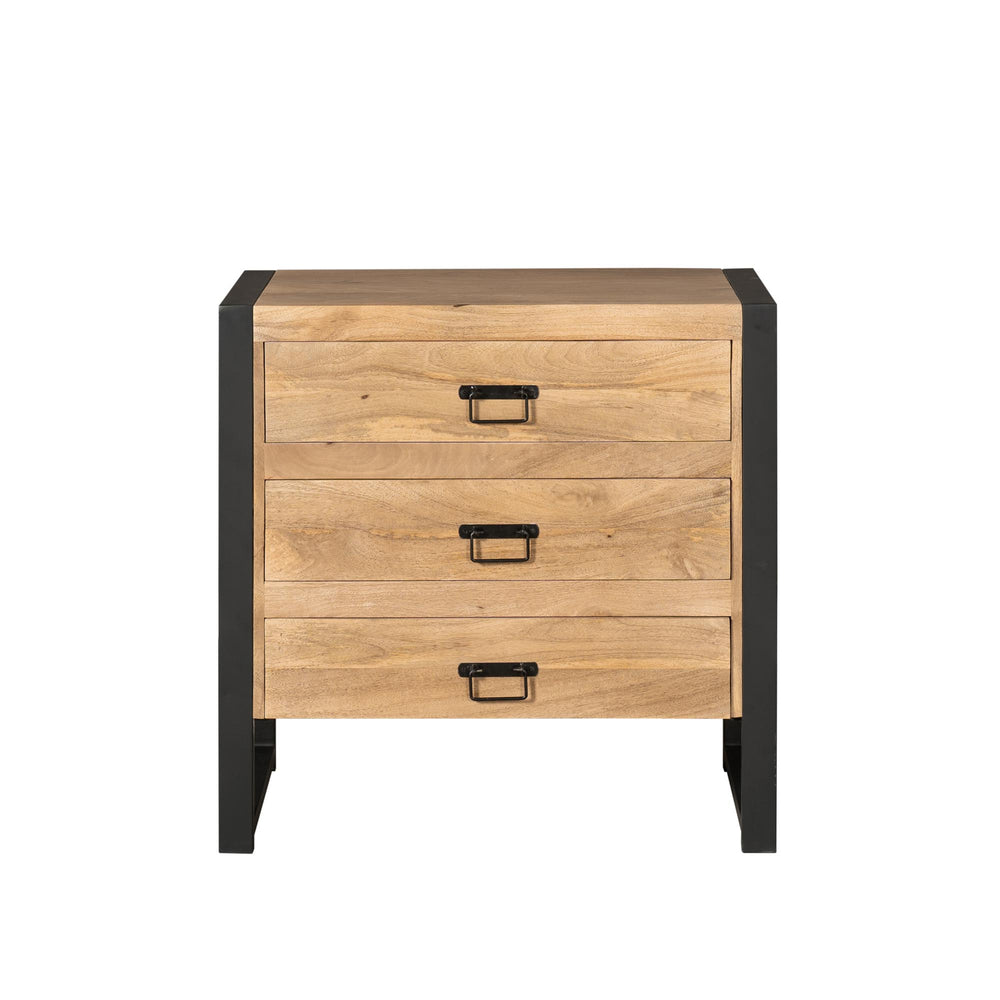 Ladenkast Britt is gemaakt van mangohout met een lichte afwerking en een zwartgelakt metalen frame en handgreep. Het strakke model heeft drie lades en een inleg van verschillende houtstroken voor een eigentijdse uitstraling. Afmetingen: B80 x D40 x H80 cm. Handgemaakt en uniek; kleine variaties in kleur en vorm horen bij het karakter. Zelfmontage (eenvoudig te monteren). Onderhoud: afnemen met een lichtvochtige doek. Land van herkomst: India. Merk: Starfurn.