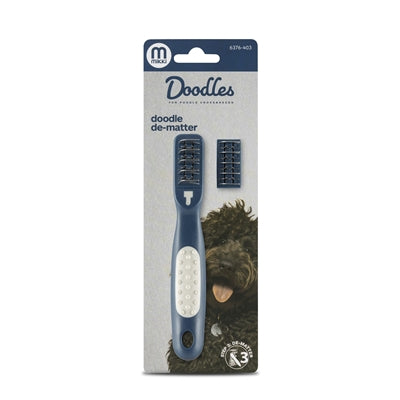 De Mikki Doodle De-Matter is de ideale tool om thuis de vacht van jouw doodle te onderhouden. Door elke dag de vacht vijf minuten te verzorgen, voorkom je vervilting en houdt je jouw huisdier schoon. Met deze De-Matter van Mikki heb je alles in huis om thuis de vacht goed te verzorgen! Heeft jouw doodle toch wat klitten die je er niet uit krijgt met kammen? De De-Matter van Mikki biedt dan een uitkomst. Houd het haar bij de wortel vast om te voorkomen dat het aan de huid trekt en gebruik korte bewegingen om voorzichtig door het geknoopte gebied te kammen. Neem voor klitten die groter zijn dan een erwt contact op met jouw trimmer in plaats van te proberen het zelf te ontwarren.