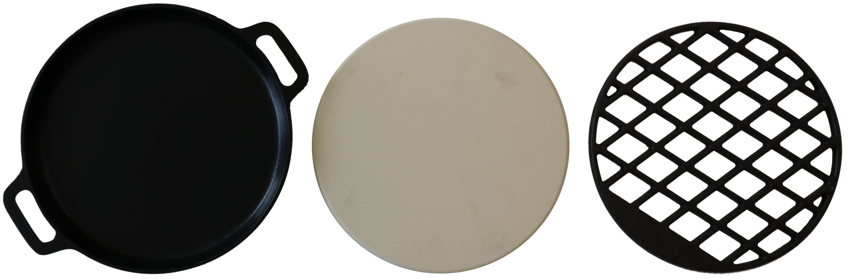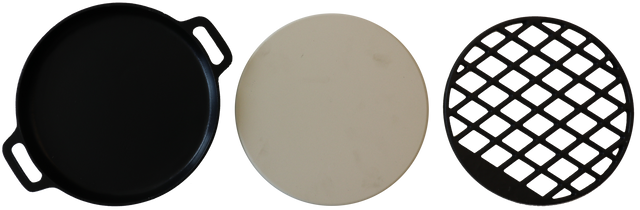 De Multi Grill Combination set is de meest veelzijdige set voor het grillrooster bestaande uit een pizza steen, gietijzeren skillet (pan) en gietijzeren grillrooster welke is te gebruiken i.c.m. het grillrooster t.b.v. de Patton Barrel Chef en Patton Charcoal Gold modellen. Aangezien het middendeel van het grillrooster t.b.v. de modellen Patton Patio Pro Chef en Kettle Chef uitneembaar is, is deze te vervangen door één van de roosters vanuit de Multi Grill Combination set. Je kunt daarmee in één handomdraai je grillrooster aanpassen en gebruiken als pizzasteen, of wel bakplaat voor het grillen van b.v. groenten, vis, schaaldieren of andere tere produkten, dan wel het gietijzeren grillrooster v.z.v. ruit patroon gebruiken om jouw groot vlees (b.v. steak) op de juiste temperatuur de kenmerkende grill-marks mee te kunnen geven. Grill als een echte pro met de uitgebreide mogelijkheden van deze Multi Grill Combination set, te gebruiken in een grillrooster met een uitsparing van 30 cm.