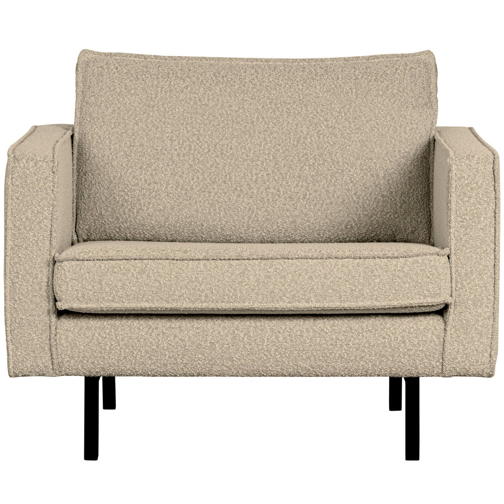 De Rodeo fauteuil is opgebouwd uit een combinatie van massief hout, spaanplaat, polyurethaan schuim met een dichtheid van 25 kg/m3 en een zigzag vering. De zitting bevat een polyurethaan schuim met een dichtheid van 30 kg/m3 (T3037). De rugleuning bestaat uit een combinatie van 70% gesneden schuim en 30% siliconen. Deze Rodeo is bekleed met zachte boucle. Het materiaal van de Colmar boucle stof speelt in op de laatste trend: zachte materialen. De stof is zacht en heeft een elegante textuur die meteen warmte in huis brengt. Onze Colmar boucle stof heeft een Martindale van 100.000, dat betekent dat de stof geschikt is voor intensief gebruik. De dichte weeftechniek zorgt voor de sterkte van de stof, dit maakt dat de boucle niet snel zal slijten of scheuren. Ook heeft elke kleur een hoge kleurvastheid, maar het is aangeraden om direct zonlicht te vermijden om kleurnuances te voorkomen.
