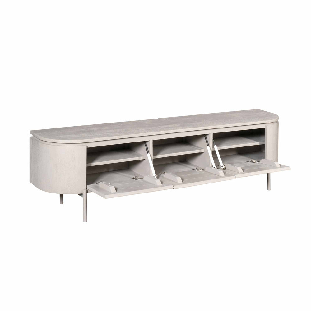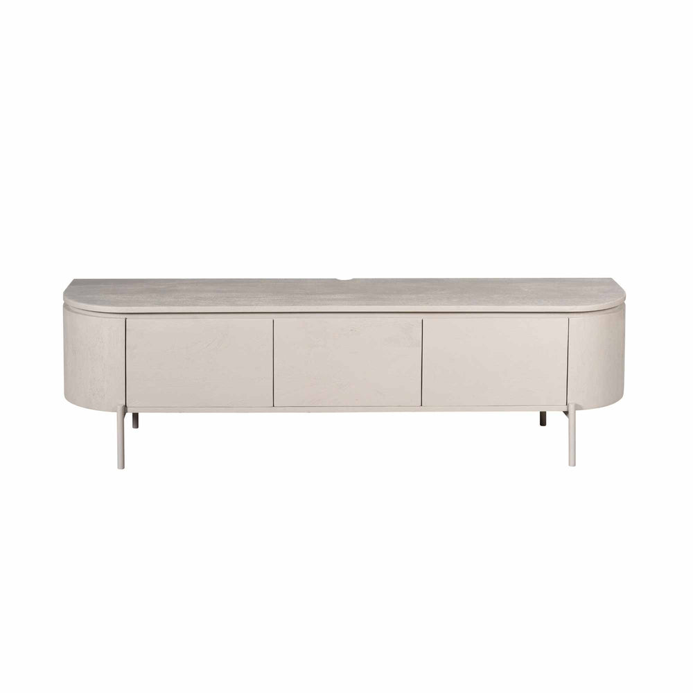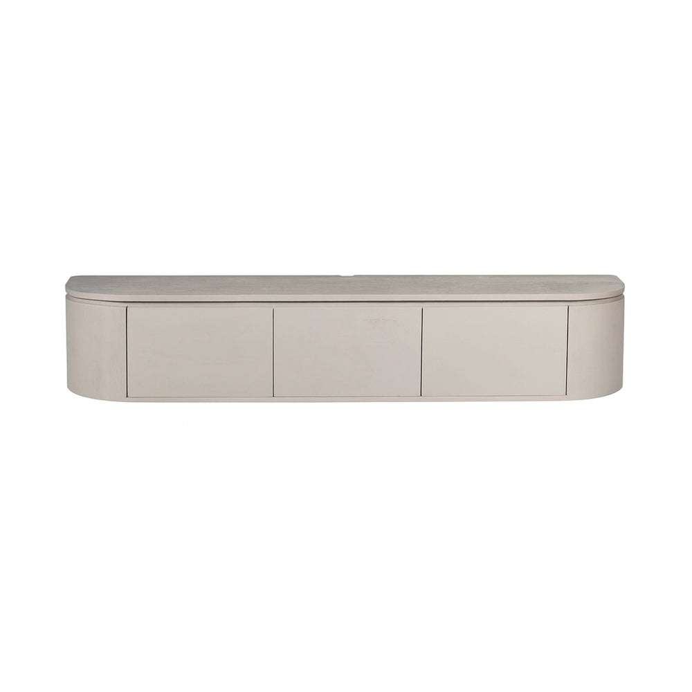 Excellent Taupe tv-meubel van mangohout met een zwevend ontwerp; pootjes worden meegeleverd voor eenvoudig ombouwen naar een staand model. Drie deurtjes voor royale opbergruimte. Verkrijgbaar in meerdere maten en kleuren. Met de hand gemaakt — kleine onregelmatigheden geven karakter. Let op: bij wandmontage geschikt alleen voor tv’s met muurbeugel. Afmetingen: B 160 x D 35 x H 35 cm. Materiaal: mangohout; poten: metaal. Gewicht ca. 30 kg. Herkomst: India. Niet gemonteerd (makkelijk te monteren). Onderhoud: afnemen met een lichtvochtige doek. Merk: Starfurn.