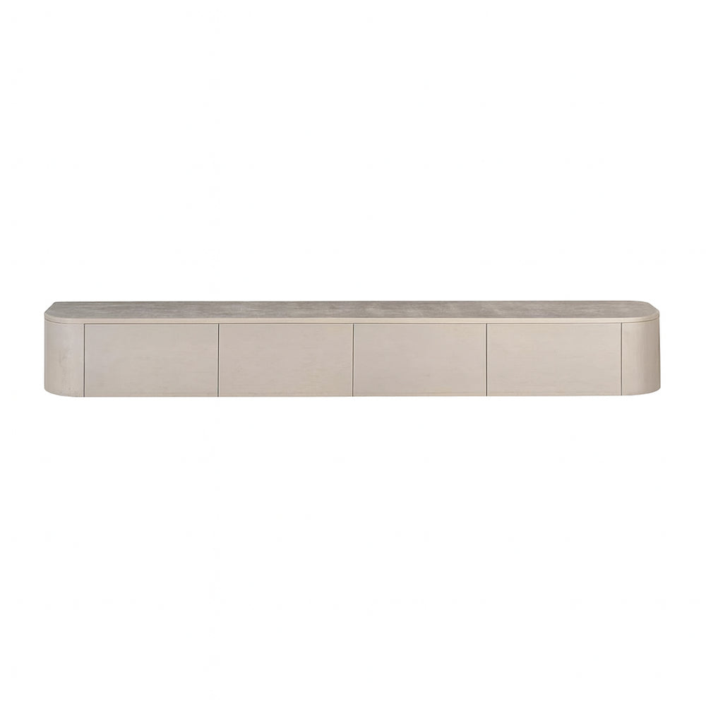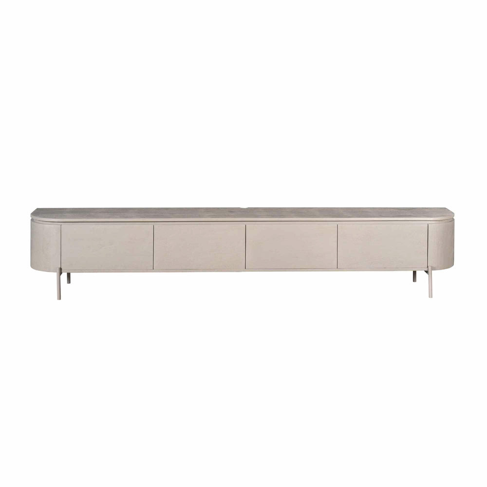 Tv-meubel Excellent Taupe van mangohout met een zwevend, luchtig ontwerp. Pootjes worden meegeleverd zodat u het eenvoudig ombouwt tot vrijstaand model (hoogte met pootjes 45 cm). Verkrijgbaar in diverse afmetingen en kleuren. Vier deuren bieden veel opbergruimte. Handgemaakt: kleine variaties in vorm en kleur versterken het authentieke karakter. Afmetingen: B200 x D35 x H30 cm. Gewicht ca. 38 kg. Wordt niet gemonteerd (eenvoudige montage). Onderhoud: lichtvochtig doek. Let op: bij muurbevestiging alleen geschikt voor tv’s met een muurbeugel.