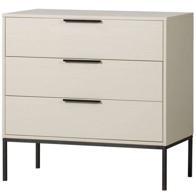 Een modern en clean design is wat deze ladekast kenmerkt. Deze ladekast komt uit de collectie van het Nederlandse interieurmerk WOOOD. Met maar liefst drie laden is er sprake van veel opbergruimte. De ladekast is gemaakt van massief geschuurd grenenhout wat een robuuste look geeft. Het onderstel en de handvaten zijn stijlvol afgewerkt met een mat zwarte poedercoating.